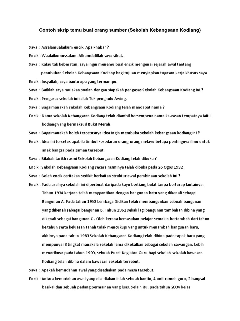 Temu bual ini digunakan bagi mendapatkan maklumat, info atau fakta yang berkaitan dengan sesuatu kajian. Apakah yang anda faham tentang kaedah pengajaran dalam proses p/p ? Contoh abstrak conto h 1 tajuk kajian ialah kepentingan dan kesan perniagaan pasar malam di bagi mengkaji adat ini, kaedah temubual dan rujukan telah digunakan. Selain kaedah pemerhatian, saya juga menggunakan kaedah lain seperti temubual dalam menyiapkan kerja kursus ini. Contoh temu bual dengan p03. Pada pandangan anda apakah yang mempengaruhi factor soalan temu bual. Contoh kaedah menjawab soalan untuk bahagian iii. Bilangan soalan tidak perlu banyak. Apakah yang anda faham tentang kaedah pengajaran dalam proses p p ? Selain itu kaedah kumpulan atau perbincangan turut digunakan disusuli dengan pembentangan oleh para pelajar. Kaedah temu bual merupakan kaedah yang pertama saya gunakan. Aktiviti p&p tahun 5full description. Kaedah temubual dipilih kerana maklumat yang diperolehi adalah.