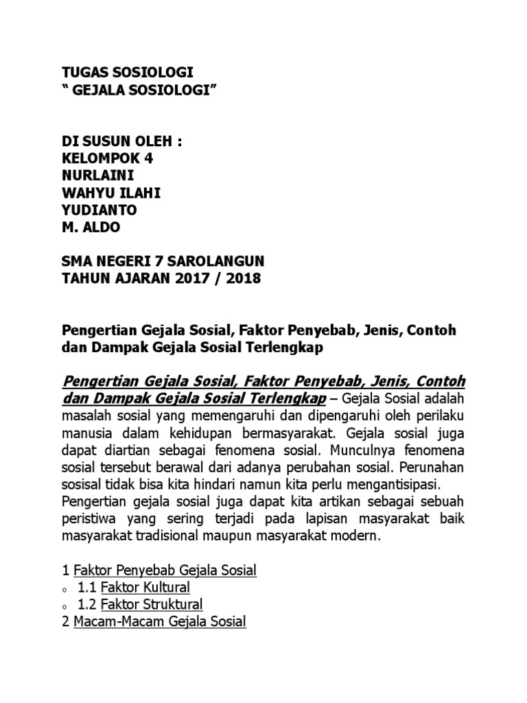Gejala sosial merupakan salah satu contoh fenomena sosial yang terjadi di masyarakat dan sudah tidak asing lagi. Berikut adalah beberapa jenis gejala sosial yang sering terjadi. Yang dimaksud dengan penyandang masalah kesejahteraan sosial (pmks) adalah seseorang atau keluarga yang karena suatu hambatan, kesulitan atau gangguan tidak dapat melaksanakan fungsi sosialnya dan karenanya tidak dapat menjalin hubungan yang serasi dan. Contoh gejala sosial yang dipengaruhi faktor struktural diantaranya seperti penyuluhan sosial, interaksi antar individu dan lain sebagainya. Pengertian, jenis, dampak, faktor penyebab dan contoh.
