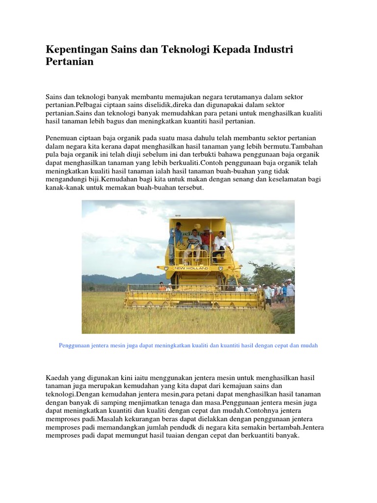Penggunaan bibit unggul dapat menghasilkan panen yang melimpah dan berkualitas. Empat teras tersebut adalah seperti yang berikut: Sains dan teknologi banyak membantu memajukan negara terutamanya dalam sektor pertanian.pelbagai ciptaan sains diselidik,direka dan digunapakai dalam sektor pertanian.sains dan teknologi banyak memudahkan para petani untuk menghasilkan kualiti hasil tanaman lebih bagus dan meningkatkan kuantiti hasil pertanian. Petani tidak lagi harus menggunakan air, pupuk, dan pestisida secara seragam di seluruh bidang. Teknologi penderiaan jauh atau remote sensing technology bukanlah suatu perkara baharu pada era revolusi industri 4.0 ini. Penggunaan p & p dalam memajukan sumber‐sumber pertanian, teknologi pengeluaran barangan dan memajukan proses yang sesuai serta juga bidang kesihatan. Namun dalam tidak sedar, teknologi ini dapat membantu meningkatkan dan mempengaruhi kehidupan seharian kita. Khusus pada artikel ini, kita akan membahas apliaksi nanoteknologi dalam bidang pertanian. Keadaan topografi juga sangat membatasi pertanian jepang, yang hanya dapat memproduksi 40% dari pangan yang dibutuhkan. Sains dan teknologi dilihat sebagai satu perkara yang prima dalam kehidupan manusia sejak memasuki abad ke 21. Pengembangan yang didasarkan pada pemanfaatan dan pengembangan sains dan teknologi. Mengetahui dampak penggunaan teknologi pertanian. Membangkitkan kesadaran masyarakat tani akan pentingnya ilmu dan teknologi pertanian.